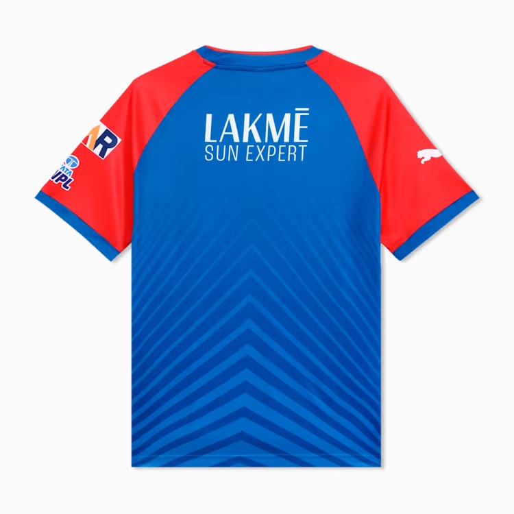 Professional Branding: High-visibility heat-pressed logos including DP World, Tata Capital, Lakmé Sun Expert on the back, and the official Delhi Capitals crest.
