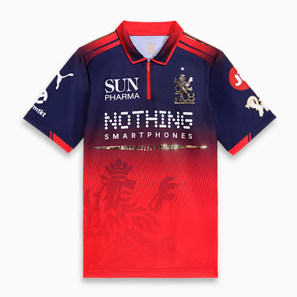 Premium Gradient Design: A striking transition from deep navy blue to vibrant red, accented by the iconic RCB lion motif ghosted into the lower panel.