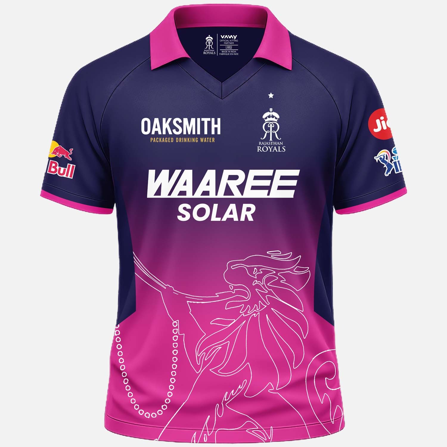 Authentic Sponsor Branding: Includes high-definition prints of Waaree Solar (Principal Sponsor), Oaksmith, Jio, and Red Bull on the sleeves.